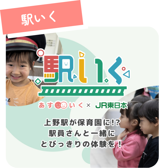 JR東日本との公式コラボイベント。駅に登園し、保育士のサポートを受けながら、駅員さんとの交流や電車見学、鉄道マナーを学習します。